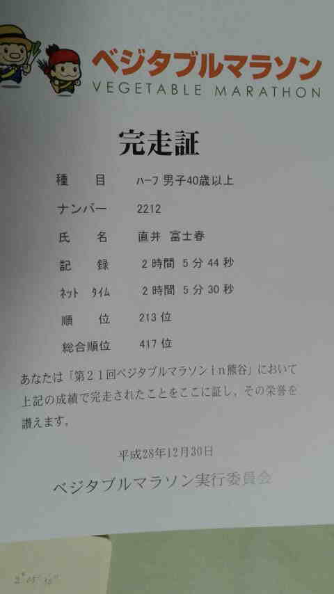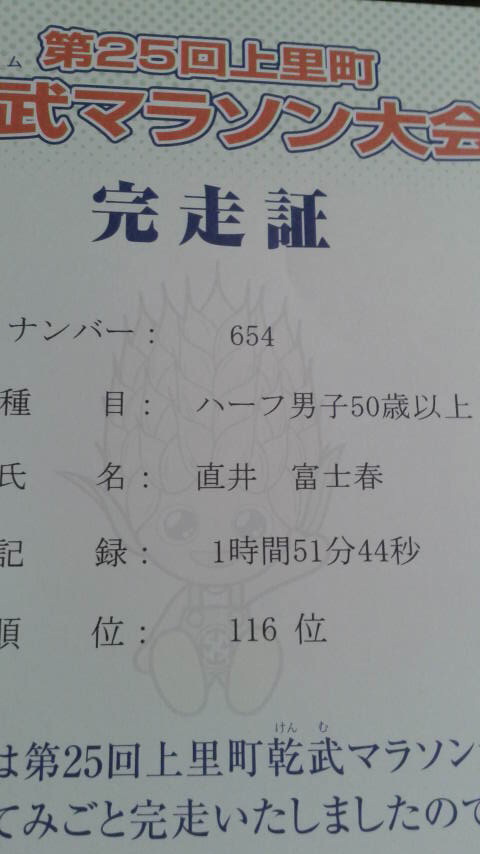 ほ〜っほっほっほ!埼玉県上里町で行われた、乾武マラソン大会で、ハーフマラソン自己ベスト更新しましたよ〜だ。