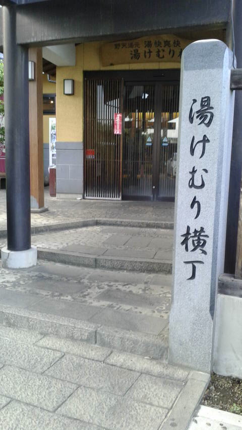 今度こそ本当に至近距離にいるはずなのに、なかなか温泉の建物が見えて来ない。原因は、おじさんの大きな顔が邪魔してるせいでした。(写真) 探してるの、お前じゃ無いよ!と全力で叫びたかったな。湯けむり横丁は、この看板の裏手。いい湯でした。