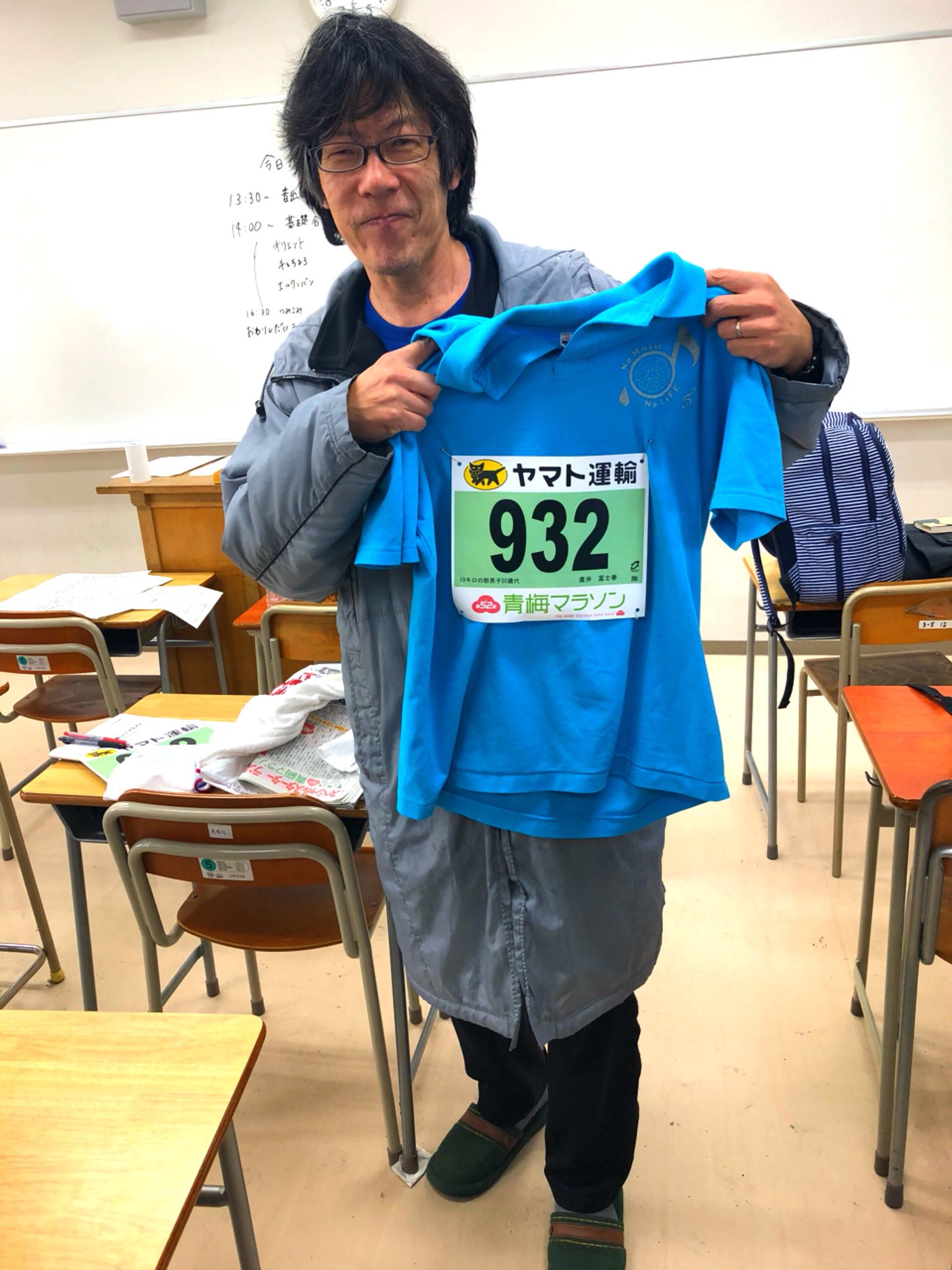 もはや冬場の私のトレードマークとも言えるこの防寒具・・・これ非売品なんですよ。読売新聞を20年以上とり続けたら、販売店のお兄さんがご褒美にくれました(笑)。テレビの視聴率30%近い大イベントのロゴマーク入りです。これを着ていて何百回聞かれたことだろうか。「直井さん、箱根を走ったことあるんですか!?」 「いや〜、応援だけですよ。はっはっは」 生徒からも同じように聞かれるけど、生徒には「走ったことあるっていうか、今度2区を走る」って答える(笑) 「ええ〜っ?あれって大学生だけでしょ?」「いや、高校の先生も参加できるんだよ」・・・どこまで嘘がバレないか、毎回挑戦しています。