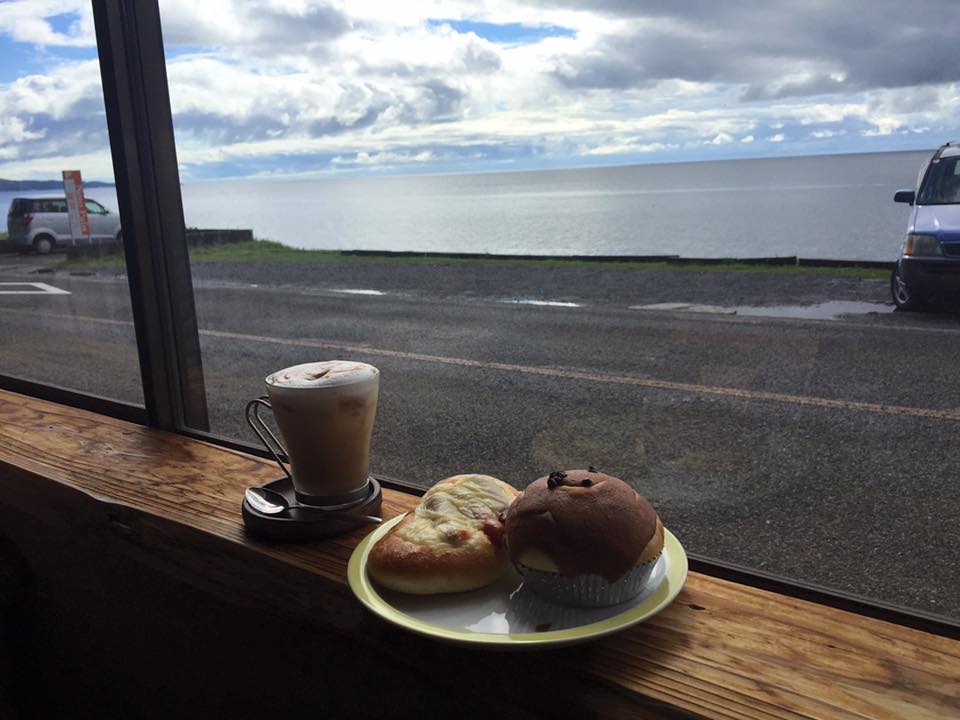 2日目の朝は、皆さん以外と早起きだ(一番若い1名を除く)。8時にはスタンバっていたので、海岸沿いの「能登パン」で朝食とする。ううう、パン美味い、コーヒー美味い、景色いい、ソファ気持ちいい・・・いつ来ても最高の気分(写真)。午前10時19分、宿のほぼ真ん前に、金沢からの特急バスが到着する。降りて来たYにゃせ君を、私とMやびさんでお迎え。Yにゃせ君は、私には一度しか会ったことがなく、宿で待っているメンバーに至っては初対面だ。それでも一緒に旅行しちゃうんだから、音楽仲間って面白い。